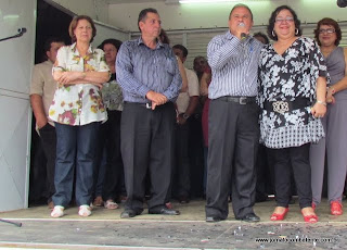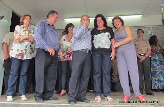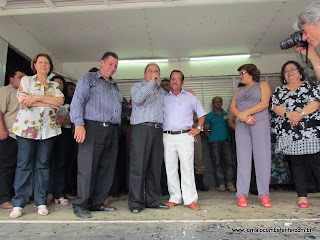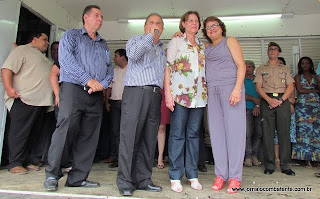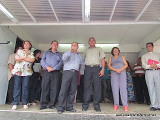 Clerinho e Armandinho descerraram a placa inaugural e junto a suas esposas fizeram o descerramento da Fita Inaugural da Sede do Poder Executivo Farialemense - o Paço Municipal. Sob as bençãos do Padre Jusciano.