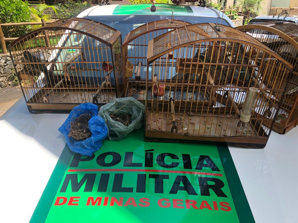 No total, os policiais apreenderam um viveiro, quatro gaiolas, dez pássaros da fauna silvestre: um corrupião/sofrê, quatro trinca-ferro adultos e cinco trinca-ferro filhotes, dois ninhos e duas motocicletas.